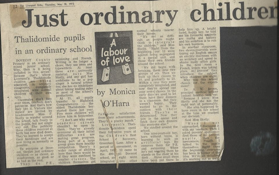 Miss Skelly took thirteen of us (all fellow Thalidomiders) to her school in Dovecot, which was 12 miles away from where I lived. It was April 1969 when integration began in Dovecot.